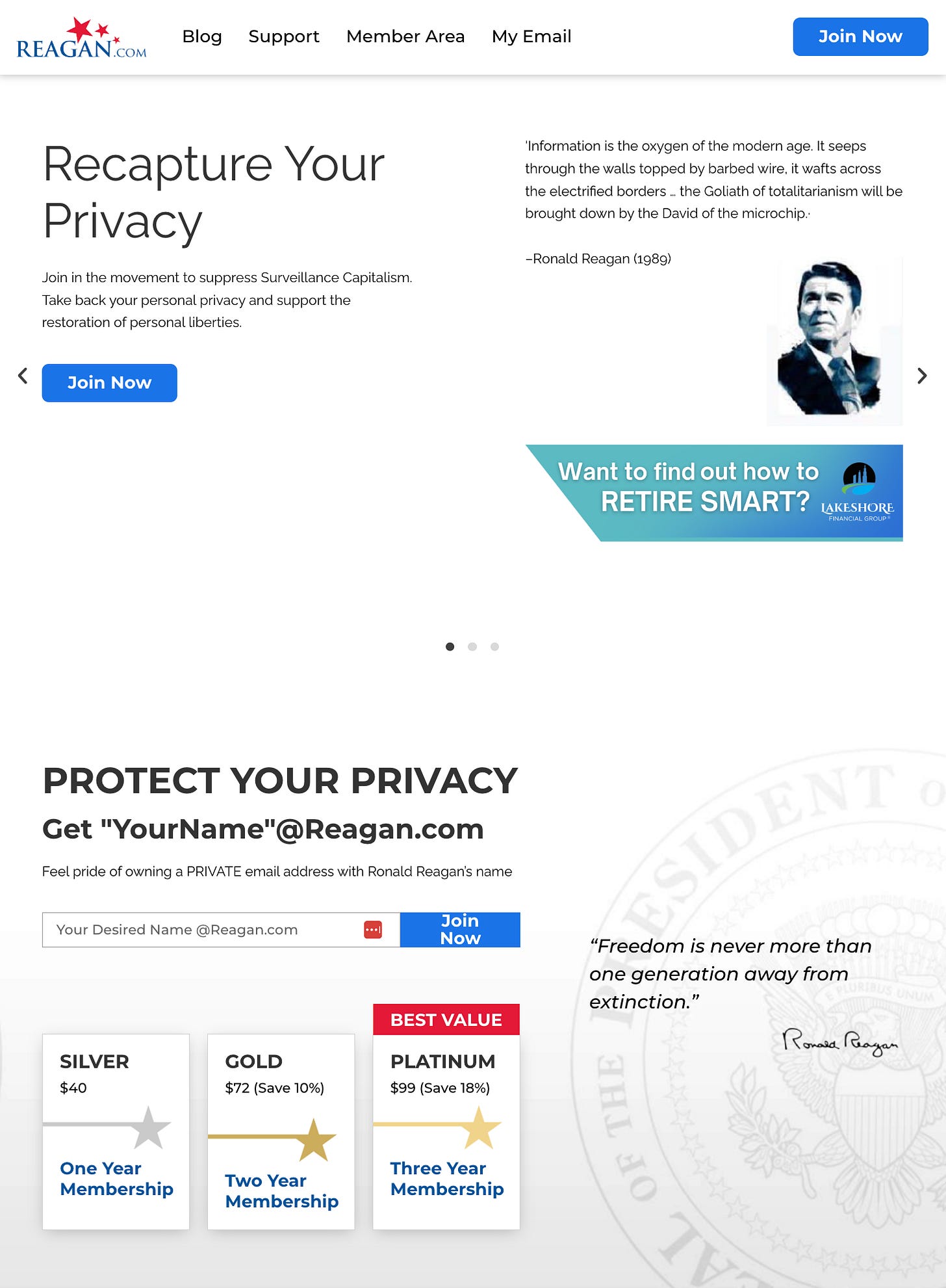 Reagan.com markets itself as a “private email” service emphasizing conservative American values and privacy.
