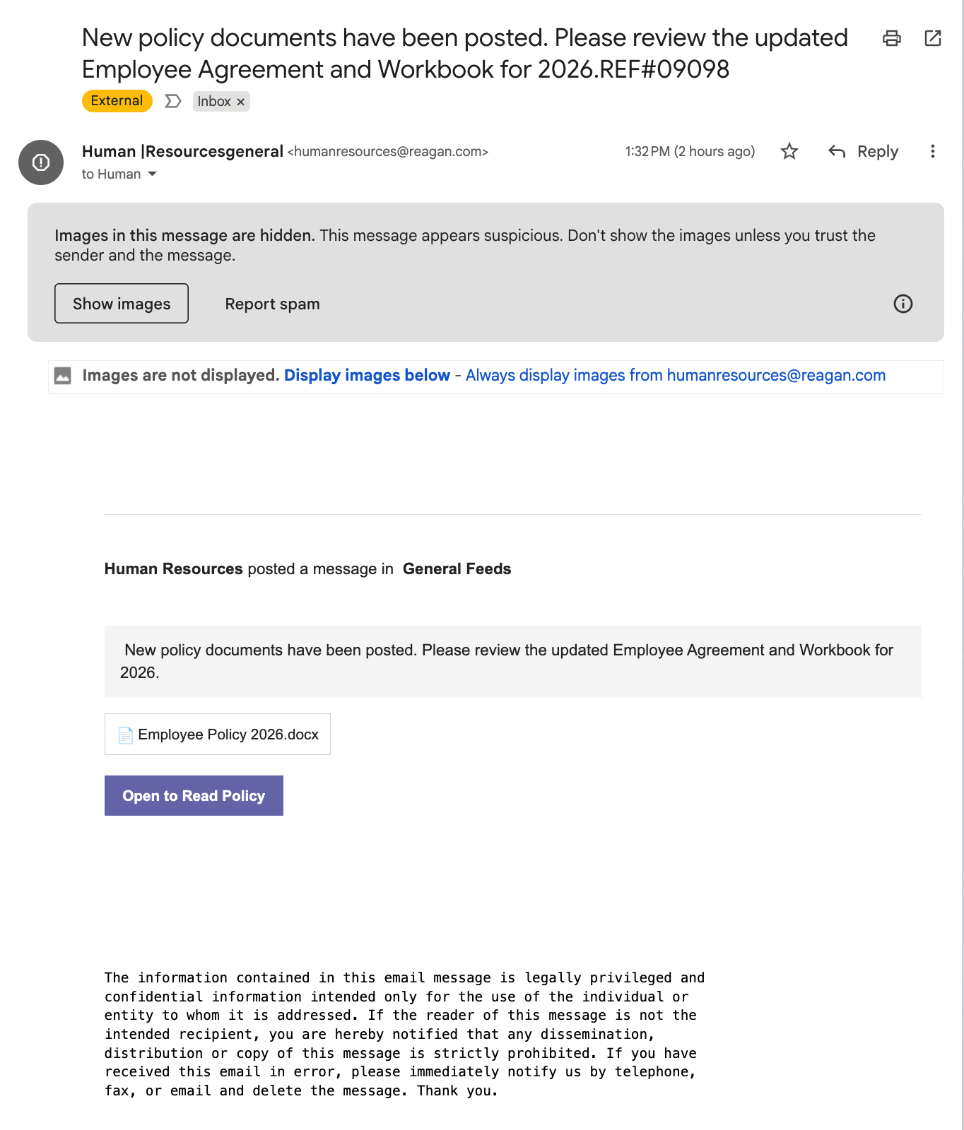 The subject line read: “New policy documents have been posted. Please review the updated Employee Agreement and Workbook for 2026.REF#09098”.