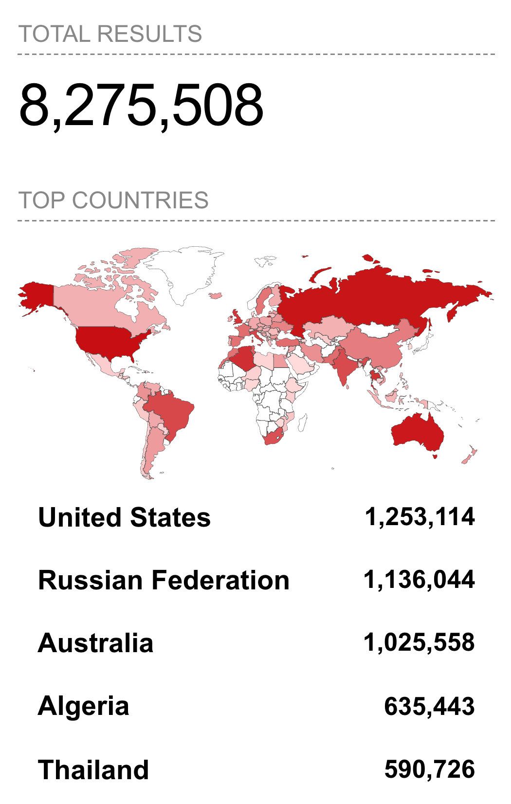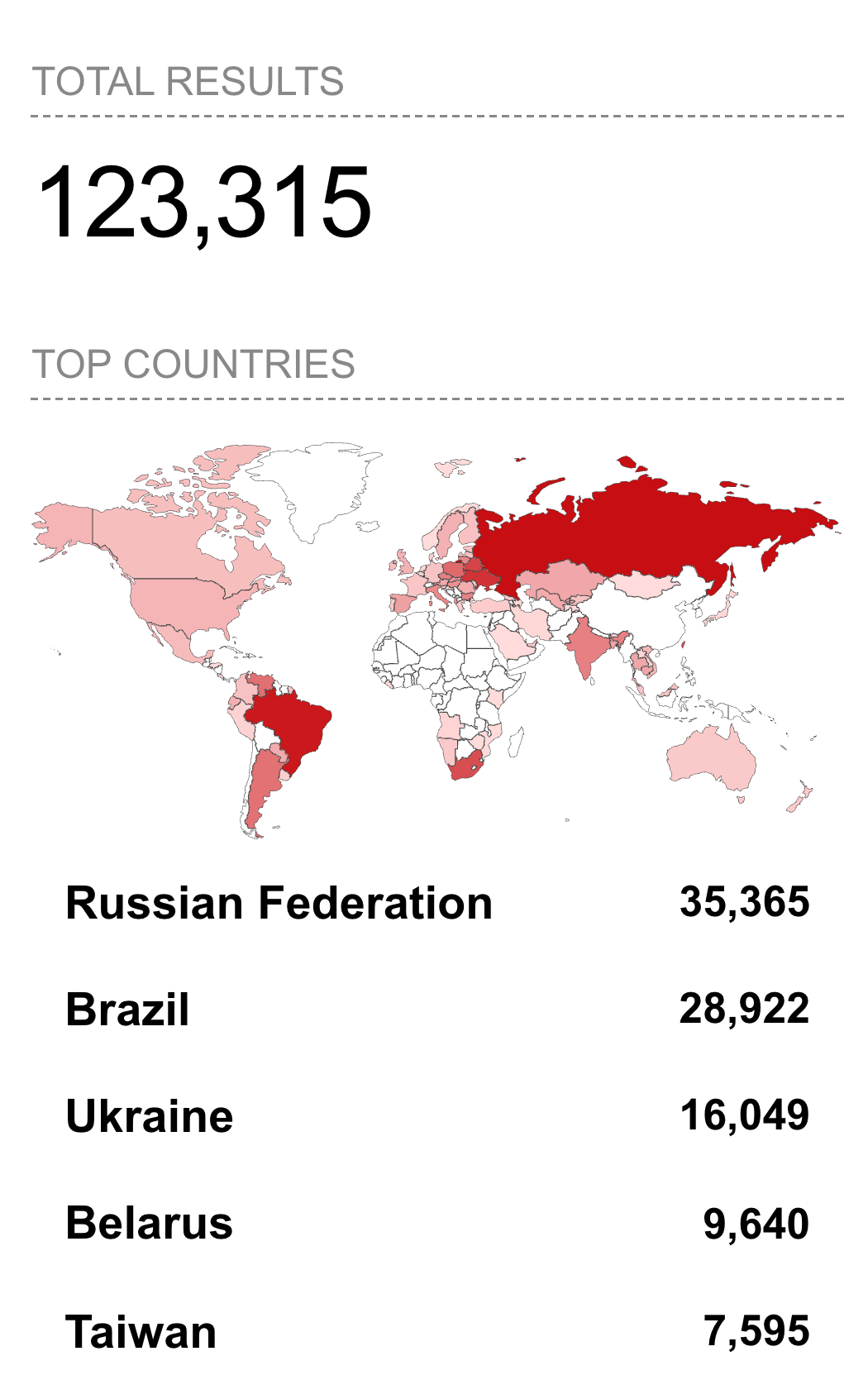 A Shodan search for the open port and vulnerable status shows 123,315 vulnerable devices exposed to the Internet, with the vast majority of devices located in Russia, Brazil, Ukraine, Belarus, and Taiwan.