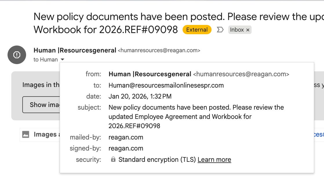 When the email arrived in my Gmail inbox, it displayed as coming from humanresources@reagan.com. The subject line, timing, and sender all appeared vaguely legitimate.