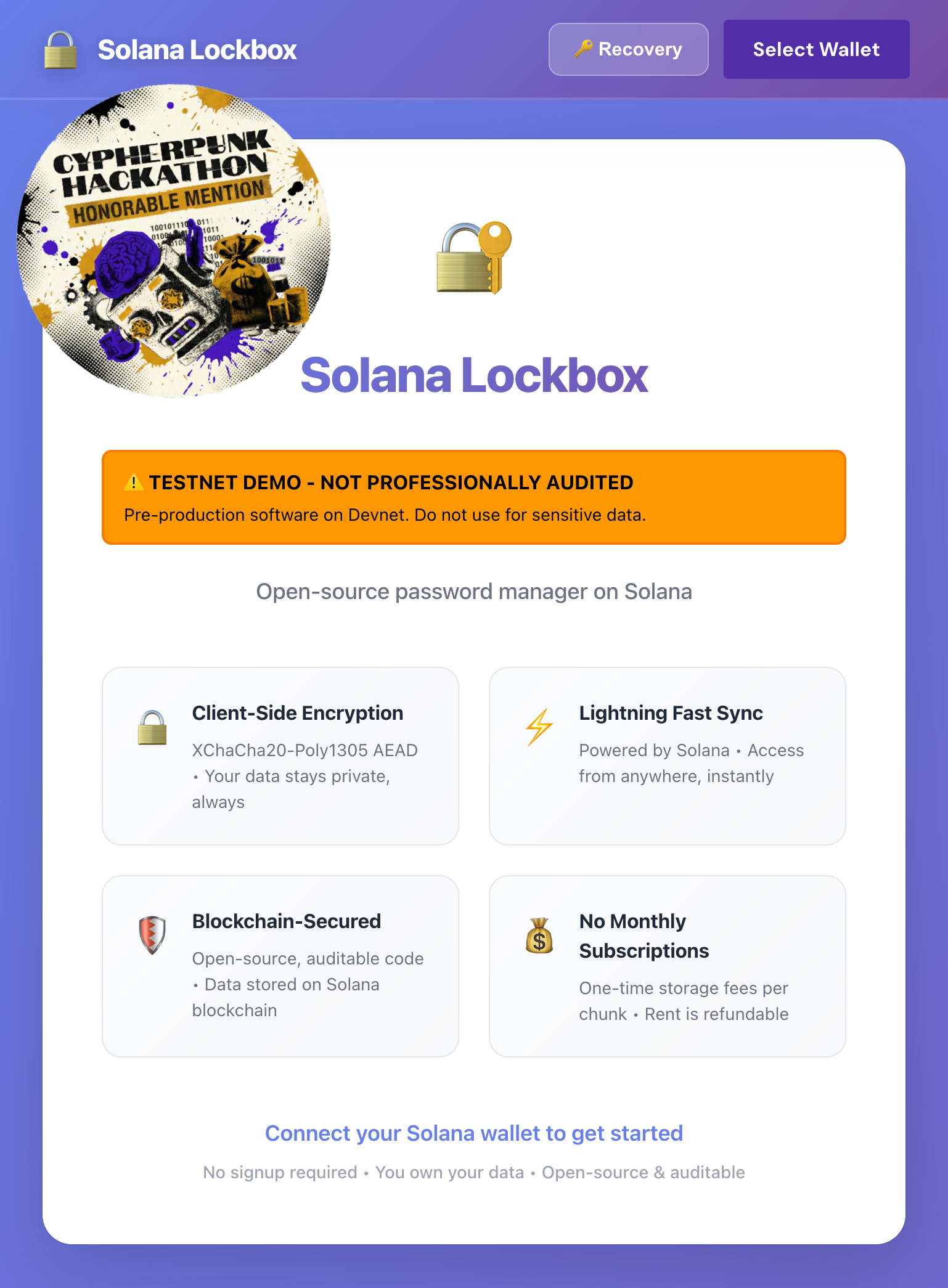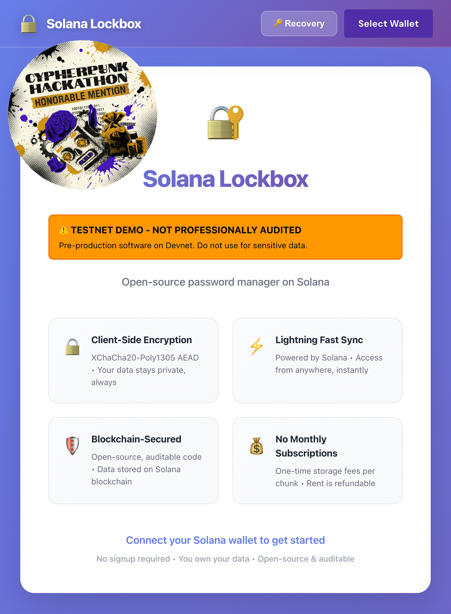 Lockbox just received a coveted honorable mention at the Solana Cypherpunk Hackathon, the largest crypto hackathon on record.