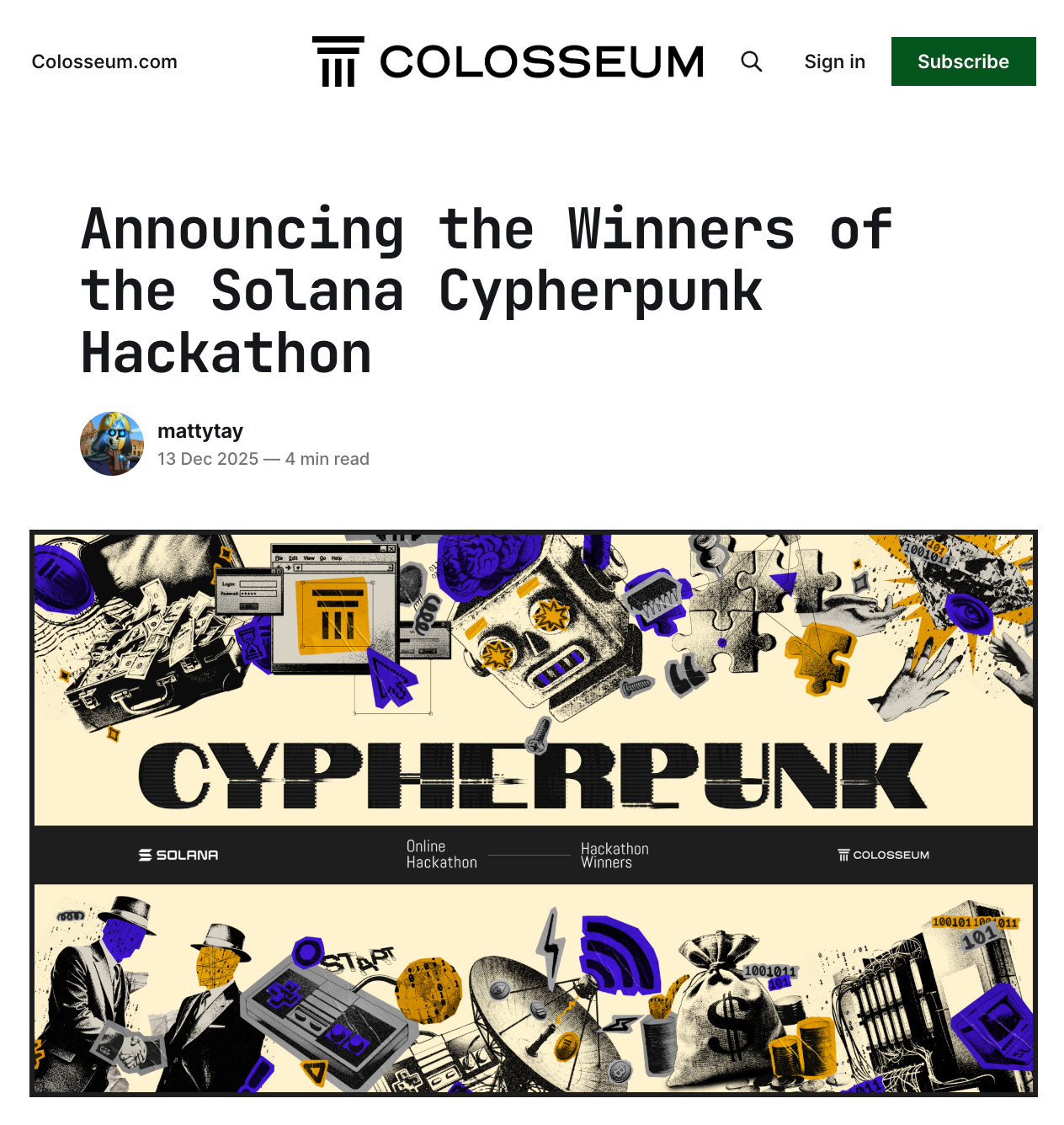 Solana Breakpoint is the main industry event where the ecosystem gathers each year to see what builders have actually shipped. The Cypherpunk Hackathon winners were announced there, which meant the top projects had a real audience watching: other developers, founders with capital, and people who actually understand what good technical work looks like.