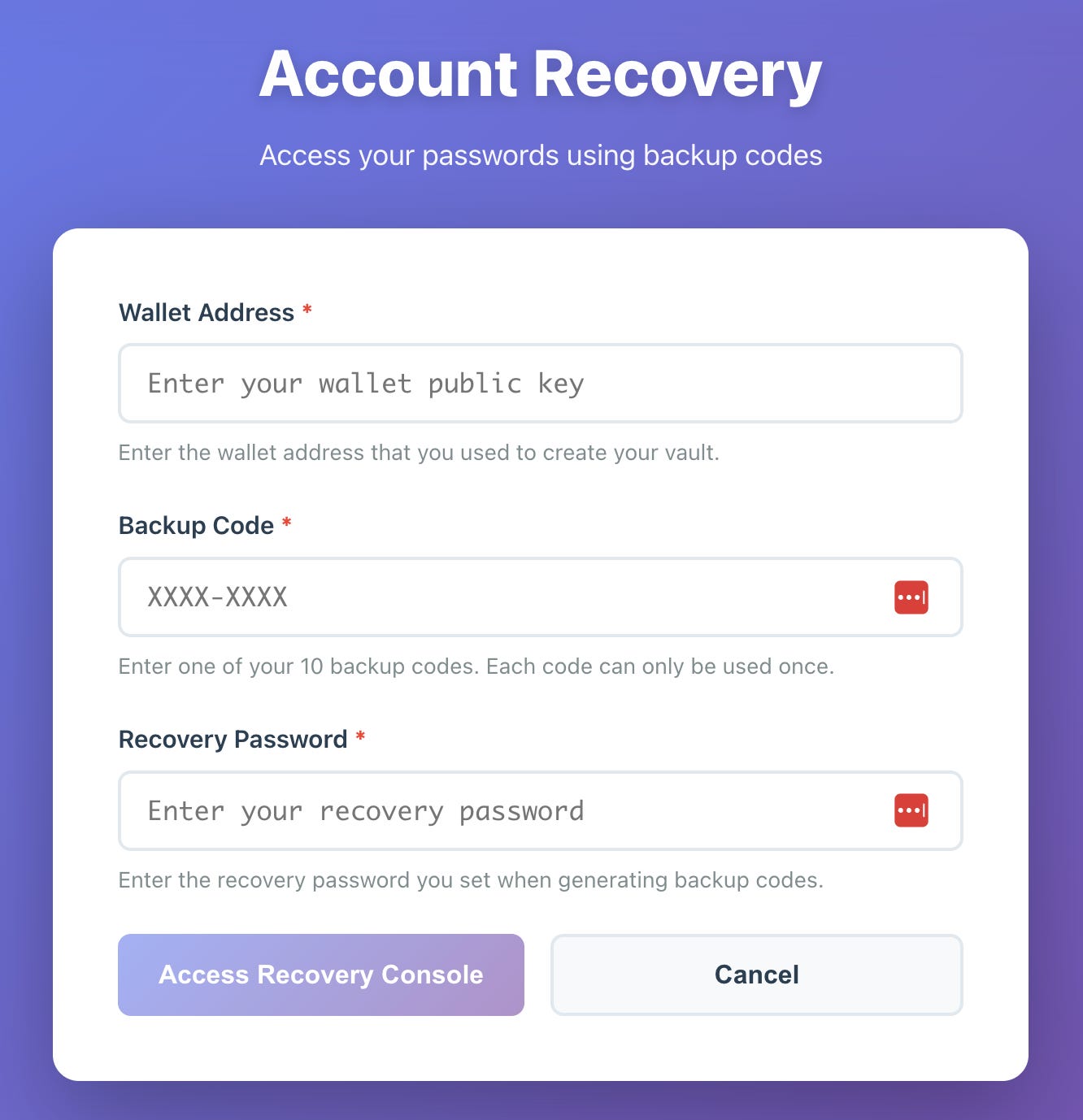They are generated using a cryptographic scheme that produces short, memorable codes that can be stored offline. When a user later wants to recover access after losing their wallet keys, they can use one of these codes to restore access to a subset of their vault data. The codes themselves don’t store plaintext; they’re derived from the recovery seed in a way that allows verification and re-encryption with new key material.