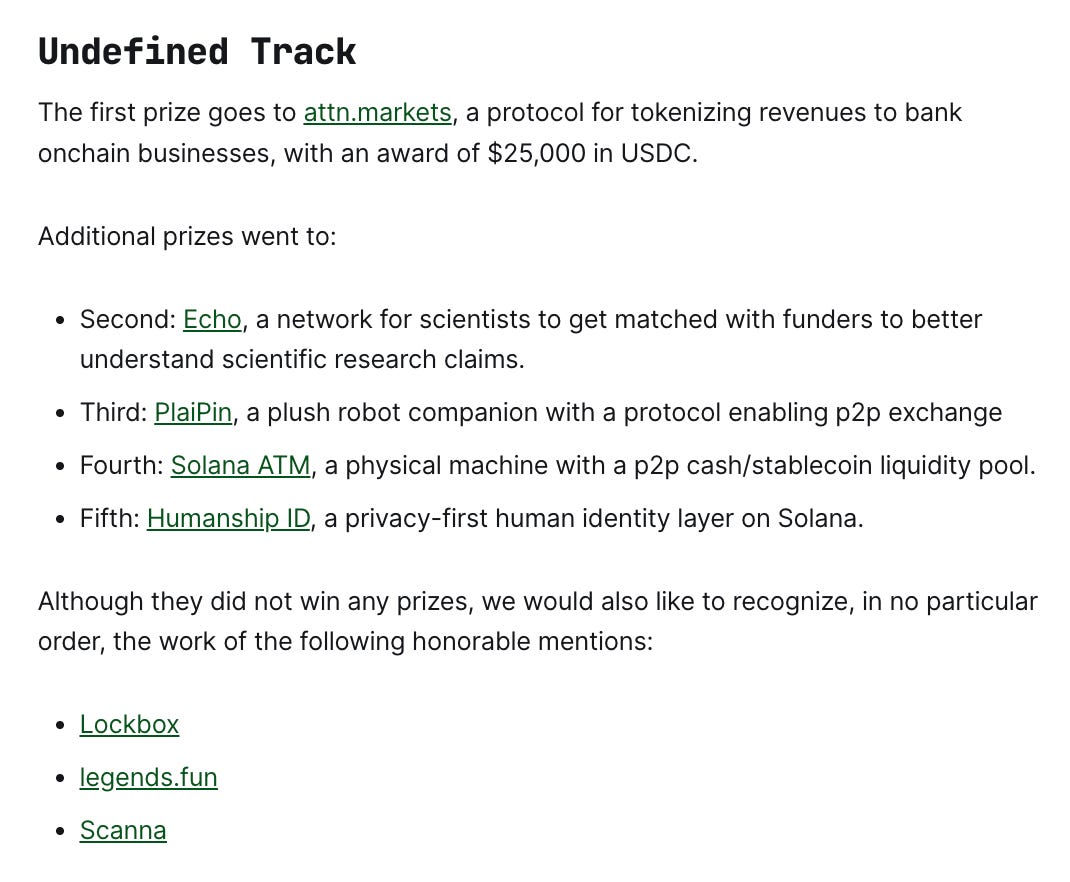 First place went to attn.markets with its revenue tokenization protocol. Second through Fifth places went to Echo, PlaiPin, Solana ATM, and Humanship ID, respectively. Honorable mentions in that track included legends.fun and Scanna.