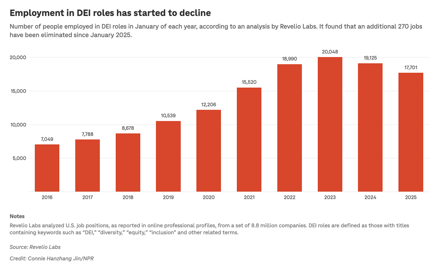 More than twenty-six hundred jobs carrying “diversity” or “DEI” in the title have been eliminated since early 2023. The Pentagon cut or restructured a hundred and eighty-eight related positions.
